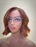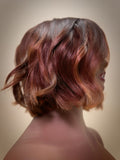 8” copper colored side part bob with strawberry blonde highlights